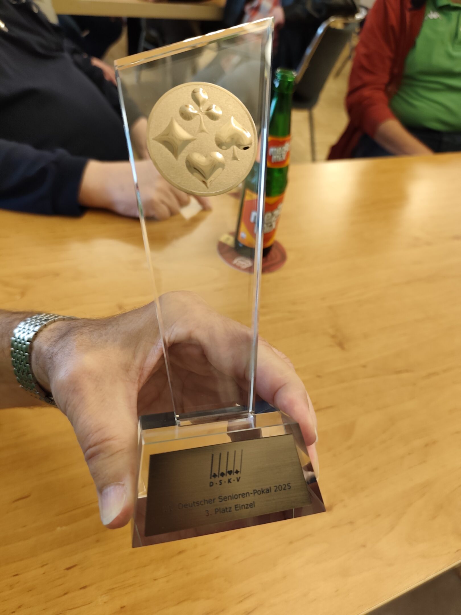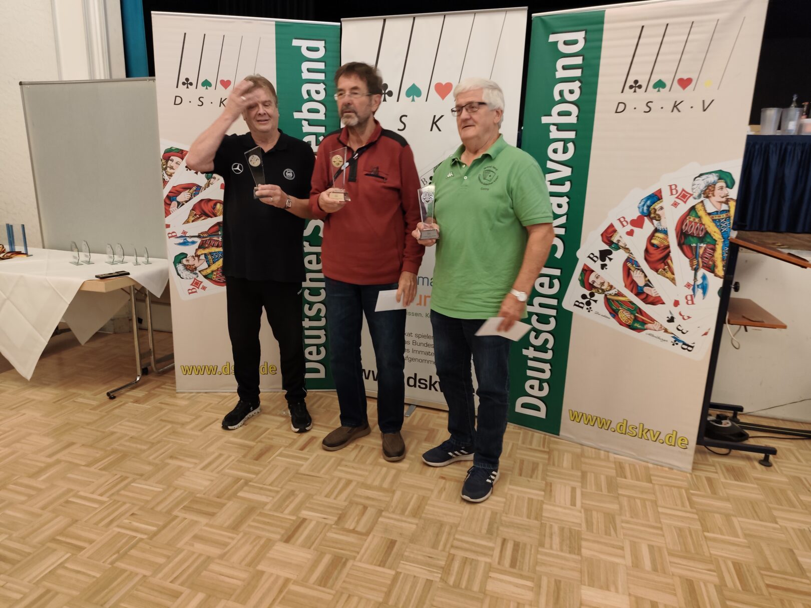 Ziel der Seniorenmannschaft war es, im Schnitt 1.000 Punkte zu erreichen. Doch dieses Ziel erreichte nur Conny mit 5.287 Punkten und damit den 3. Platz. Hubert verfehlte nur knapp mit 4.241 Punkten das Ziel und landete damit auf dem 50. Platz von 203 Teilnehmern. Somit kam er noch in die Preisgelder. Für Ludger mit 3.241 Punkten und Johannes mit 3.037 Punkten hatte der „Skatgott“ kein einsehen. Alle fünf Serien a 40 Spiele liefen an ihnen vorbei. Conny und Ludger belegten im Tandem noch den 19. Platz und bekamen somit noch einen Geldpreis.